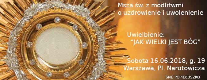 Zapraszamy na ostatnią (przynajmniej przed wakacjami) Mszę św. oraz modlitwy o uzdrowienie i uwolnienie, dnia 16 czerwca 2018 r. Tym razem nabożeństwo będzie w formie uwielbienia pod hasłem: „Jak wielki jest Bóg”. Rozpoczęcie Mszą św. o godz. 19.00 w parafii św. Jakuba Ap. w Warszawie przy ul. Grójeckiej 38 (Plac Narutowicza).