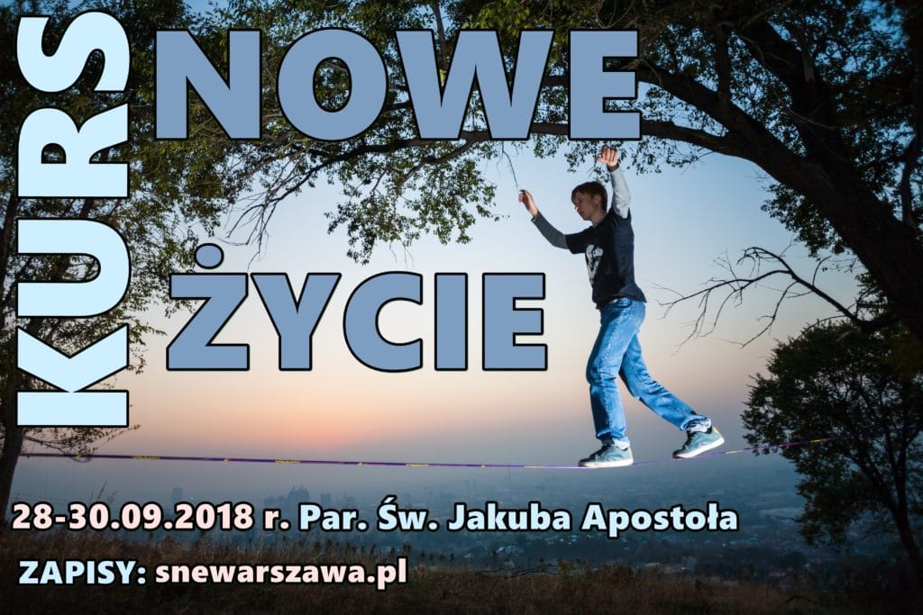 Zapraszamy do udziału w kursie „Nowe Życie”. To podstawowe rekolekcje ewangelizacyjne Szkół Nowej Ewangelizacji. Kurs odbędzie się w dniach 28-30.09.2018 r. w parafii św. Jakuba Ap. w Warszawie, przy ul. Grójeckiej 38 (Plac Narutowicza). Jest to kurs dochodzony. Przeznaczony dla osób pełnoletnich, bądź uczniów drugich klas szkół średnich, które przyjęły już sakrament bierzmowania. Więcej informacji pod adresem: snewarszawa.pl/nowezycie.