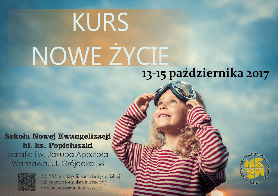 Niniejszym informujemy, że w dniach 13-15 października 2017 roku w parafii św. Jakuba w Warszawie poprowadzimy kurs ewangelizacyjny „Nowe Życie”. Zapisy głównie będą w parafii św. Jakuba. Osoby, które są zainteresowane Kursem, a nie zapiszą się osobiście, mogą zgłosić zainteresowanie udziałem w Kursie przez Internet. Jednakże na obecną chwilę zgłoszenia internetowe zostaną wpisane na listę rezerwową. Przyjęcia z tejże listy będą możliwe po 8 października. W zależności od wolnych miejsc.