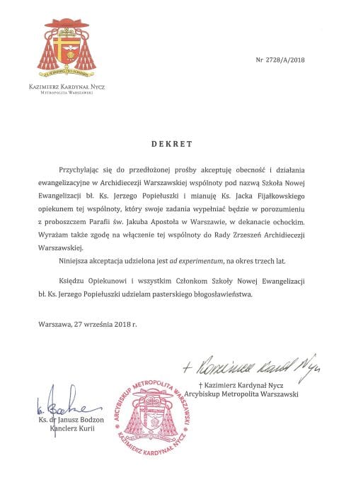 Druga radość być może jest jeszcze większa. A zapewne te dwie sprawy mają ze sobą związek. W dzień rozpoczęcia kursu odebraliśmy dekret Kardynała Kazimierza Nycza, który potwierdza, że akceptuje i błogosławi działalności naszej wspólnoty na terenie Archidiecezji Warszawskiej. Zostaliśmy także zaproszeni do Rady Zrzeszeń Katolickich Archidiecezji Warszawskiej. Poniżej skan dekretu: