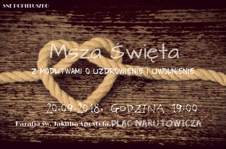 Informujemy, że w roku szkolnym 2018/2019 comiesięczne Msze św. oraz modlitwy o uzdrowienie i uwolnienie odbywać się będą w trzecie czwartki miesiąca o godz. 19.00. Pozostałe informacje i zasady udziału w nabożeństwach pozostają bez zmian. Najbliższa Msza św. połączona z modlitwami o uzdrowienie i uwolnienie odbędzie się 20 września 2018 r. o godz. 19.00 w parafii św. Jakuba Ap. w Warszawie, przy ul. Grójeckiej 38 (Plac Narutowicza).